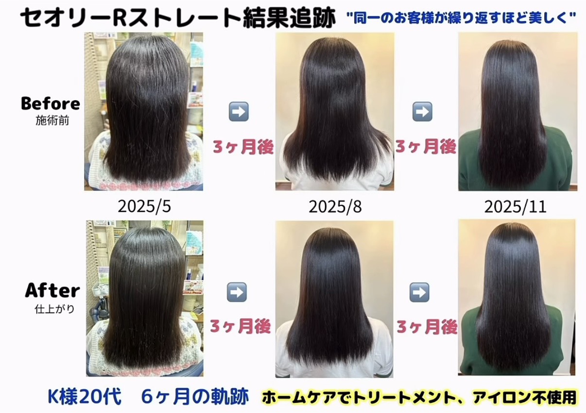 セオリーRストレートを受けられたお客様の、リアルな変化を記録しています。 初回からその後の経過まで、髪の美しさを丁寧に追いました。